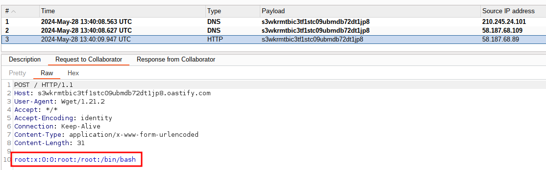 Đây là một câu lệnh sử dụng wget để gửi một POST request ra ngoài tới một domain bên ngoài, với data là kết quả của lệnh `cat /etc/passwd`. Mình sử dụng domain của Burp Collaborator để nhận request. Mọi người có thể sử dụng các ứng dụng như webhook để nhận request, hay tạo một domain bằng ngrok (hướng dẫn bởi Cookie Arena), hoặc sử dụng chính domain của mọi người nếu có điều kiện.