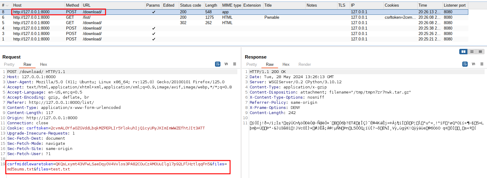 Chọn 2 file và ấn download, sau đó qua Burp Suite để xem request được gửi đi.