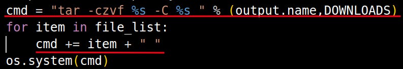cmd = "tar -czvf %s -C %s " % (output.name,DOWNLOADS)